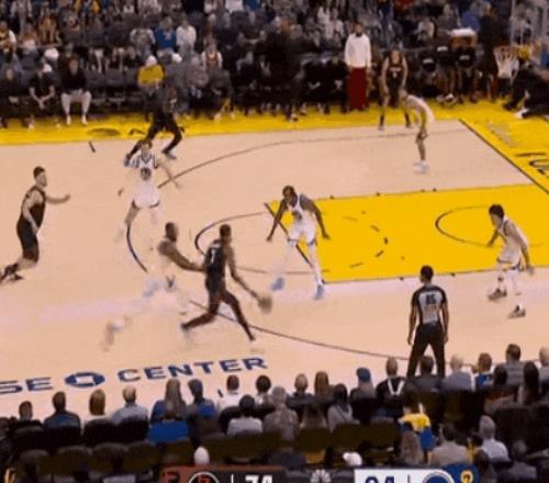 追梦内切上篮,库里喂佩顿上篮,然后和追梦一个招牌递手速投,差5分。