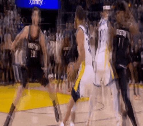 从此火箭知道了,库里手感仍在,防库里时,高重心防投了——所以后半段,库里突破从容。