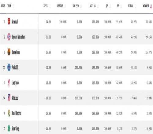 最新欧冠夺冠概率: